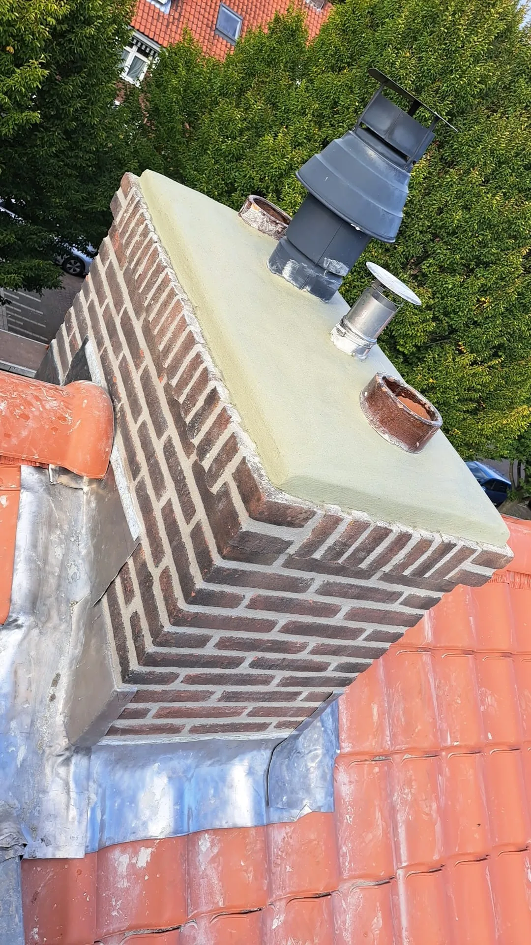 Deze controle wordt door ons standaard uitgevoerd tijdens de jaarlijkse veging van uw schoorsteen. Tijdens deze controle kijken wij de noodzakelijke loodslabben na of deze nog goed bevestigd zijn en de aansluiting met uw dak goed afgesloten is.